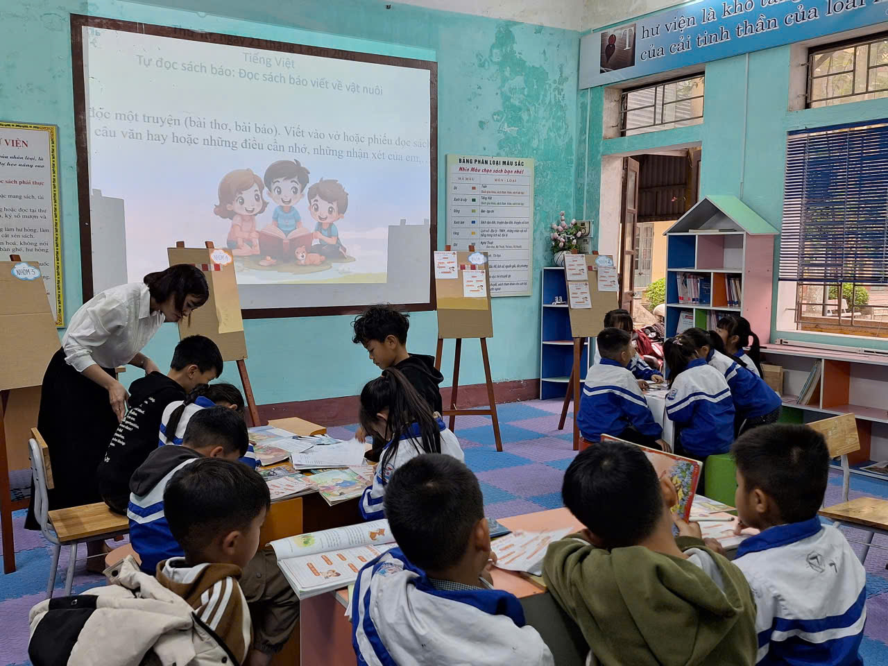 Tiết học diễn ra trong không khí thân thiện, gần gũi. Giáo viên đã linh hoạt sử dụng các hình thức tổ chức như: hướng dẫn học sinh lựa chọn sách, đọc thầm – đọc cá nhân, trao đổi nhóm nhỏ và chia sẻ trước lớp. Qua đó, học sinh không chỉ rèn luyện kĩ năng đọc mà còn mở rộng hiểu biết về thế giới vật nuôi, bồi dưỡng tình yêu thiên nhiên, ý thức chăm sóc và bảo vệ các loài vật xung quanh.